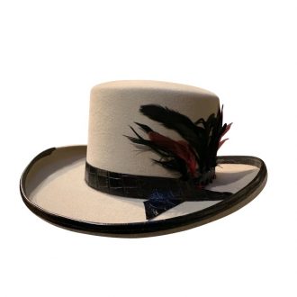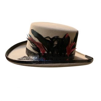 Cappello in feltro lapin stile Blues guarnito con nastro in pelle e piume. Alteza cupola 11 ...